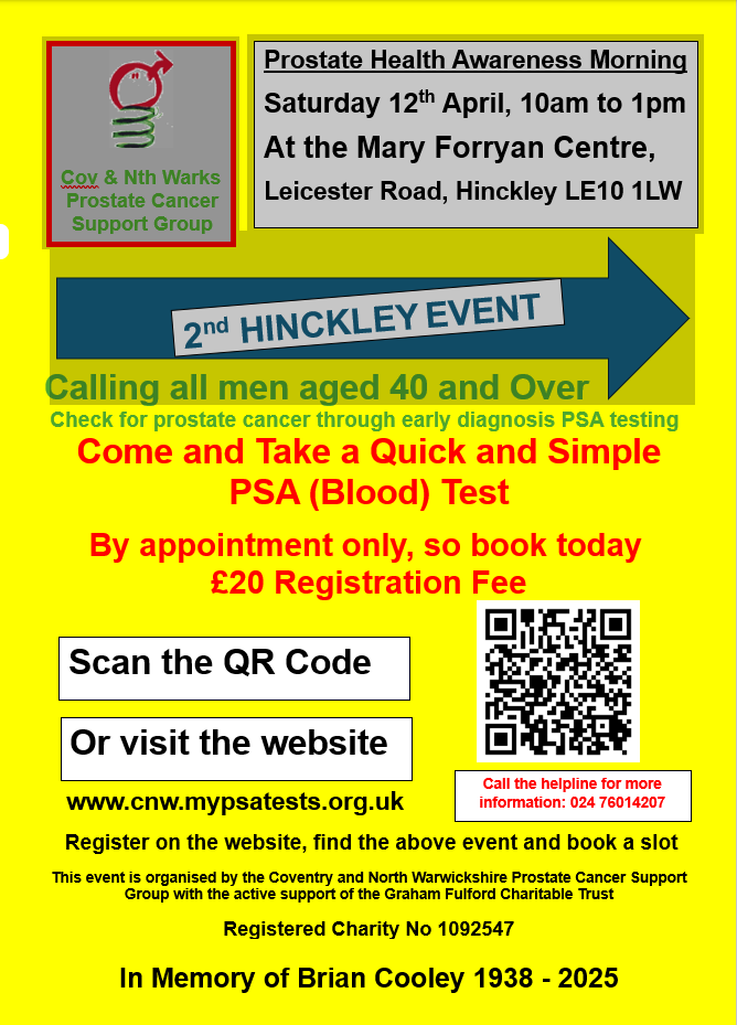 Our next Prostate Health Awareness event will be held on Saturday 28th February at Christ the KIng Parish Centre, 14 Westhill Road, Coundon, Coventry, CV6 2AA. As usual we continue to use the Graham Fulford online booking system. As a result our events run smoothly with minimal queuing and adequate social distancing. See Coming Events for more detail.
